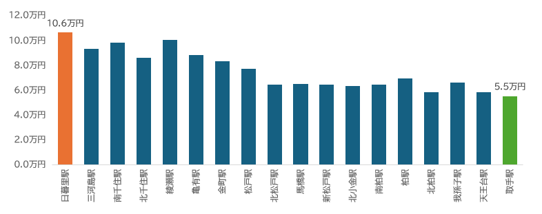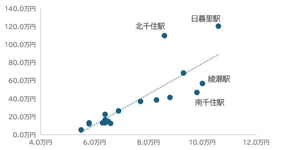 北千住駅と日暮里駅は、賃料に比して地価が突出して高いのが特徴です。いずれも交通の要衝として人気エリアですが、常磐線の駅の中で平均賃料が突出して高いわけではありません。
