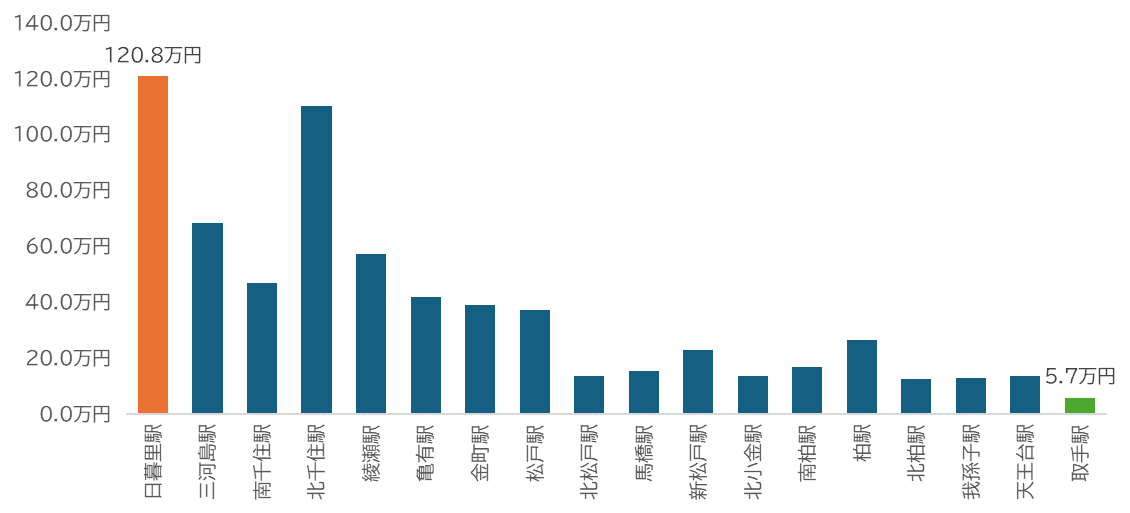 山手線沿線の日暮里が突出していて、次にさまざまな路線が乗り入れる北千住が続きます。そこからは徐々に低下しますが、特に松戸をすぎると大きく低下して、10万円台/㎡もしくはそれ以下となります。