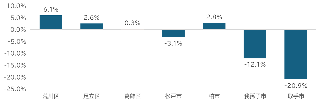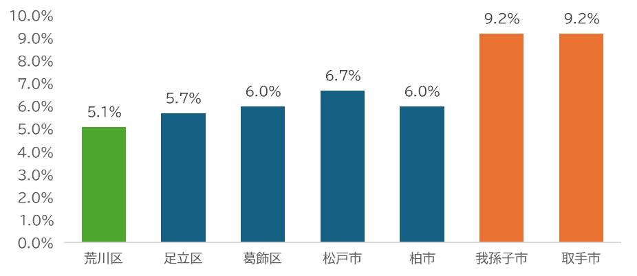 また、松戸市・葛飾区も横ばい~微減にとどまっており、堅実な経営がしやすいエリアです。我孫子市は10%以上の減少が予想されており、人口減少リスクに一定の注意が必要です。利回りの高さと堅実性のどちらを取るかによって、同エリアに対する評価は変わってくるでしょう。