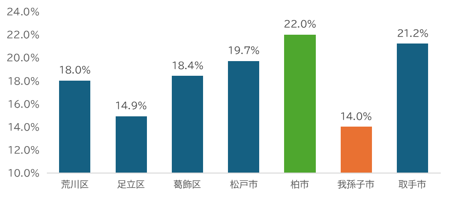 空室率は、荒川区を除くと柏市までは東に行くほど高くなります。今回の調査範囲の自治体では、柏市の空室率が最も高いのが特徴です。逆に我孫子市は最も低く、14%に留まります。