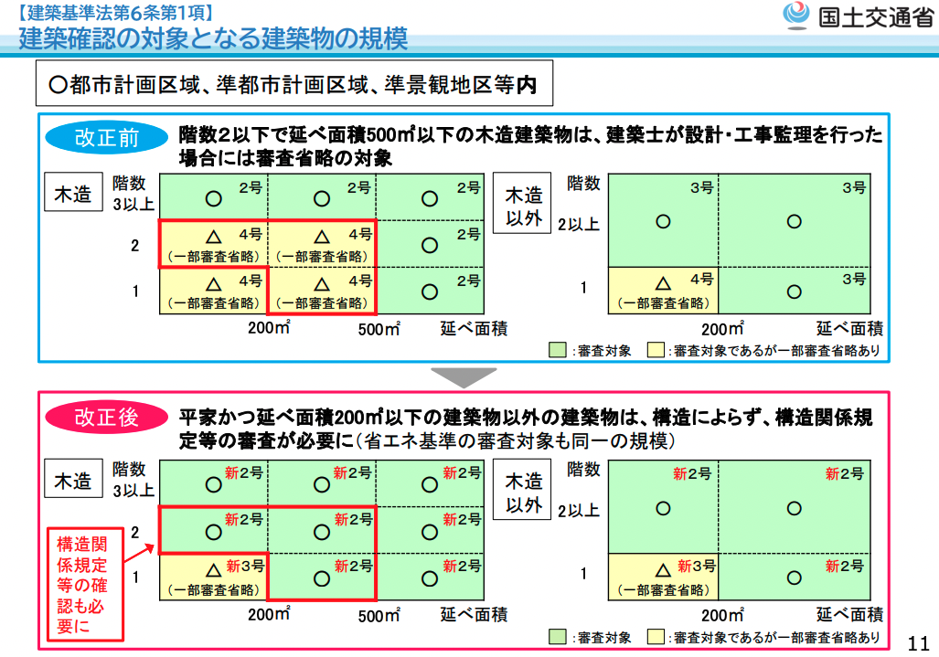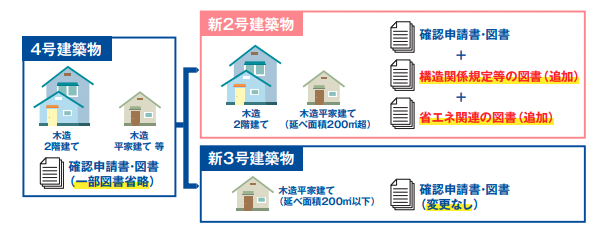 - 4号特例が廃止され、新2号建築物と新3号建築物が創設される