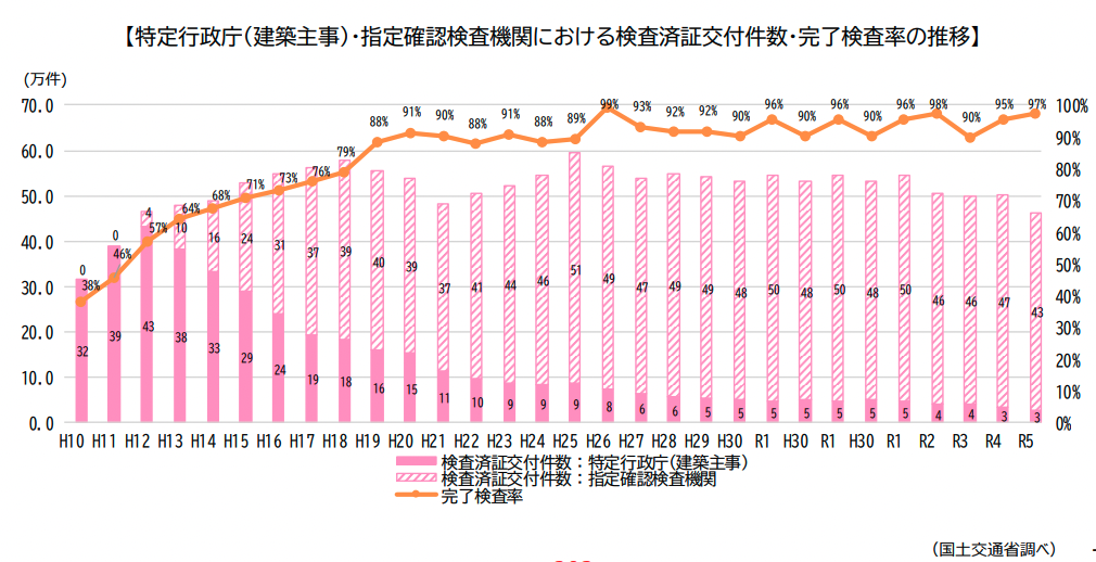 しかし、検査済証の発行が事実上の義務となったのは、2000年代以降です。事実、検査済証を発行するうえで必要な完了検査の検査率は、1998年時点で、約4割しかありませんでした。