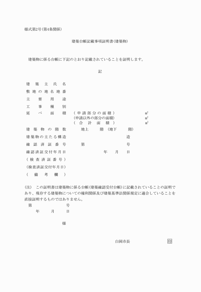 台帳記載事項証明書は、市区町村に保管されている台帳(建築確認台帳)に記載された事項を証明する書類です。確認済証や検査済証の交付年月日のほかに、敷地面積や建築面積、延べ面積などが記載されています。