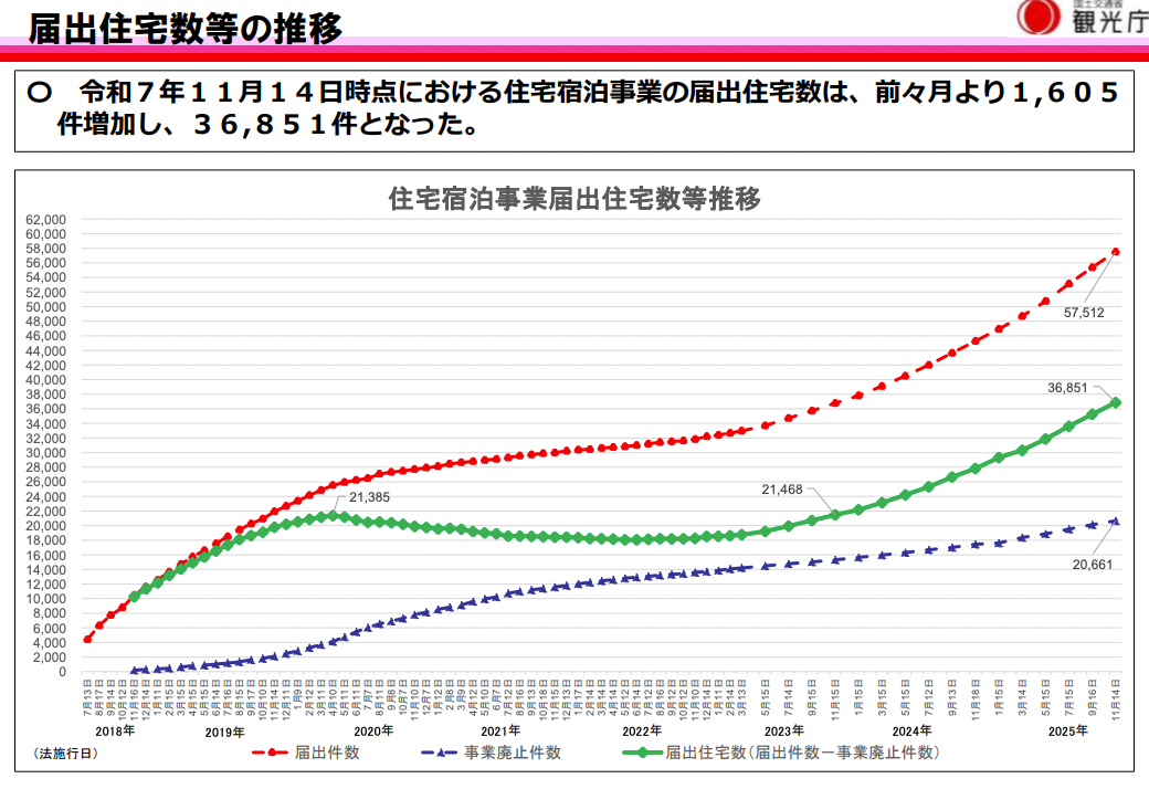 届出件数のうち、事業廃止件数は2万661件です。実際に民泊事業に利用できる届出住宅数は2025年9月より1,605件増加し、3万6,851件となっています。