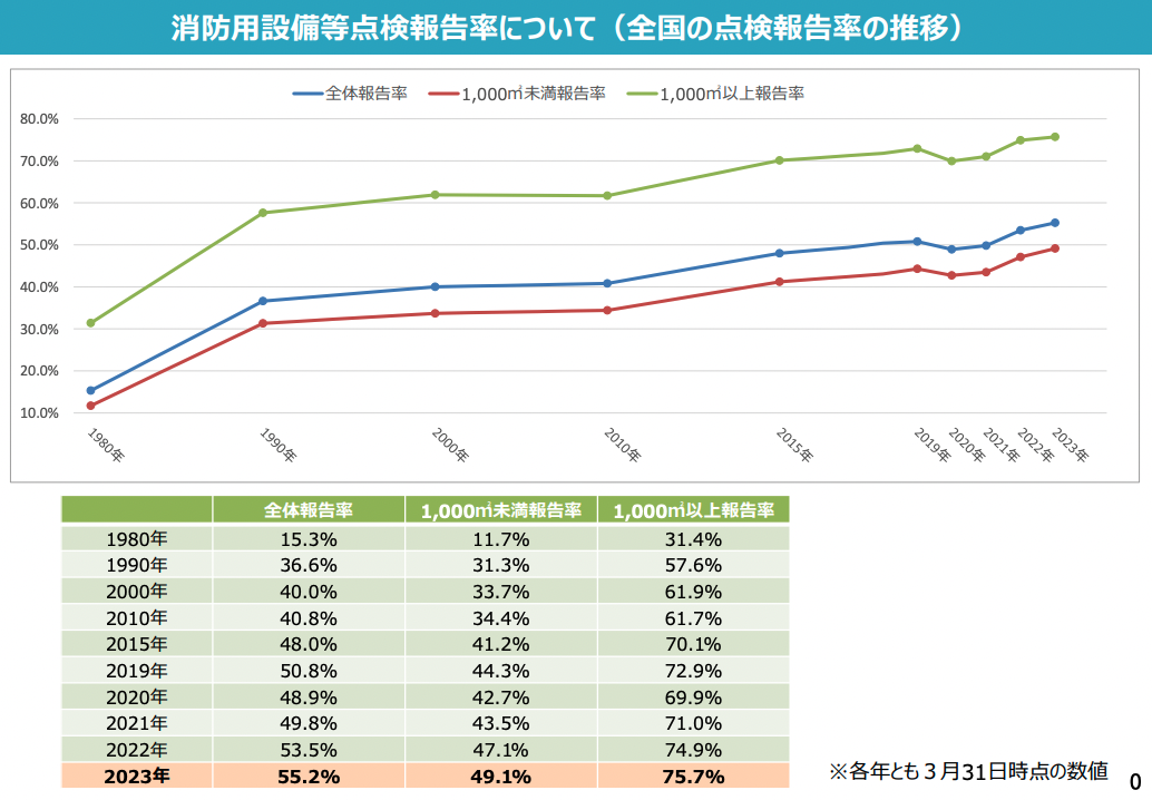 なお、消防用設備等点検の全体報告率は55.2%(1000㎡未満報告率は49.1%、1,000㎡以上の報告率は74.9%)に過ぎません。