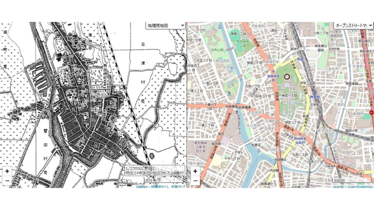明治24年の古地図を見ると、熱田神宮周辺は寺に囲まれ、他はほぼ田畑だったことがわかります。JR東海道本線は開通していますが、名鉄はまだ通っていません。