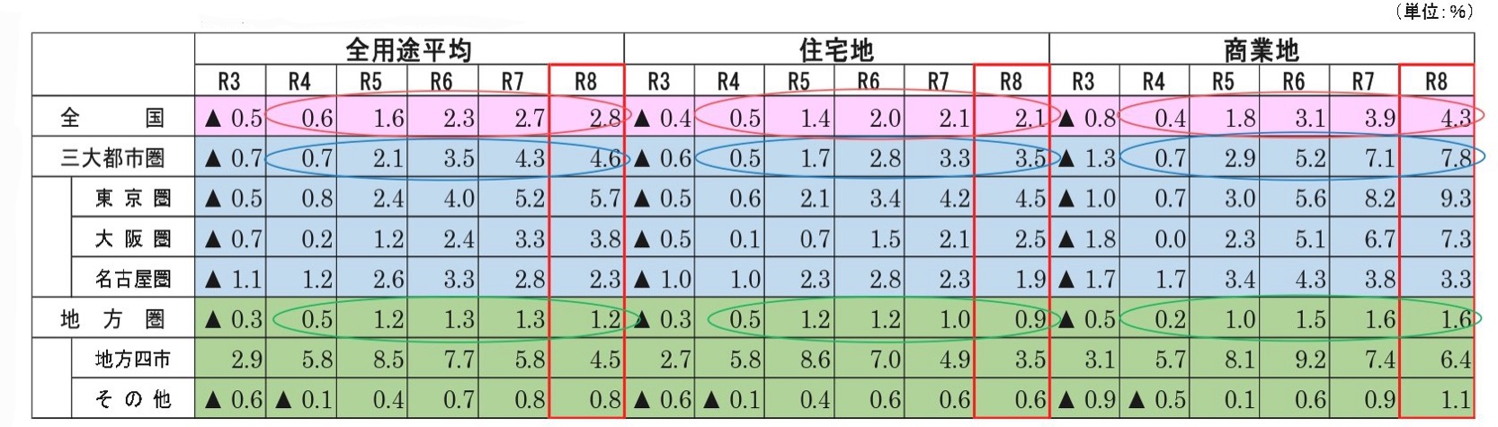 地方圏でも、全用途平均・住宅地・商業地のいずれも5年連続で上昇しました。地方四市(札幌市・仙台市・広島市・福岡市)では上昇幅がやや縮小したものの、その他の地域では人口減少が顕著にもかかわらず、おおむね拡大傾向が継続しました。
