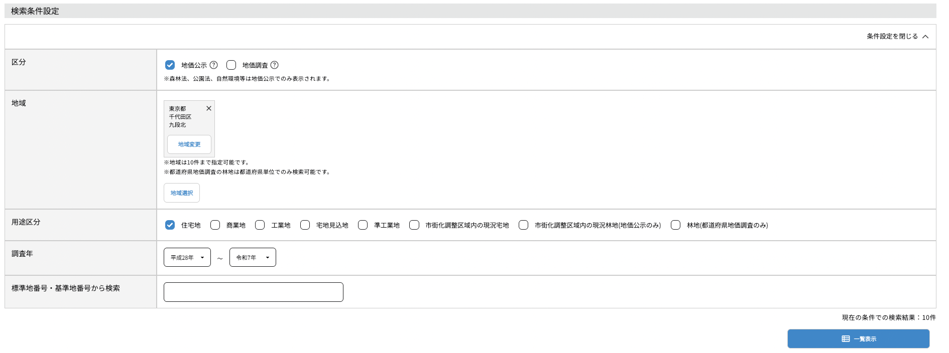 次に調べたい「地域(都道府県・市区町村・地名)」「用途区分」「調査年」を入力・選択し、検索条件設定右下にある「一覧表示」をクリックしましょう。