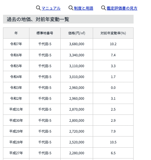 なお、「標準地番号または基準地番号」に表示された標準地番号・基準地番号をクリックすると、過去の地価と比較しながら確認することが可能です。