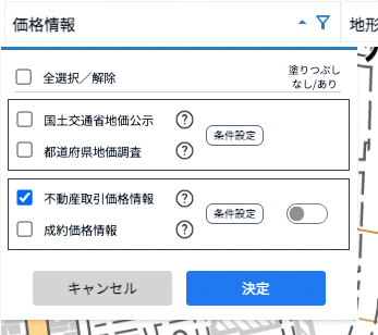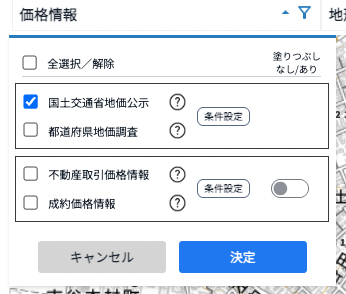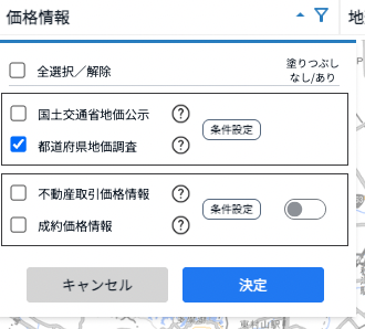 前者の不動産情報ライブラリを利用して調べる場合は、地図を開いた後、「価格情報」のタブにある「都道府県地価調査」にチェックを入れて「決定」をクリックしてください。