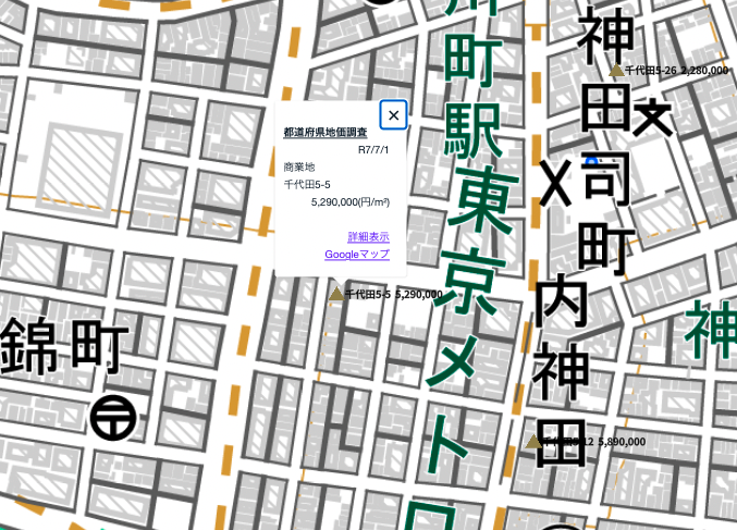 全国地価マップから調べる場合は、「地価公示・地価調査」における地図を開いた後、地図上にある三角マークをクリックしてください。