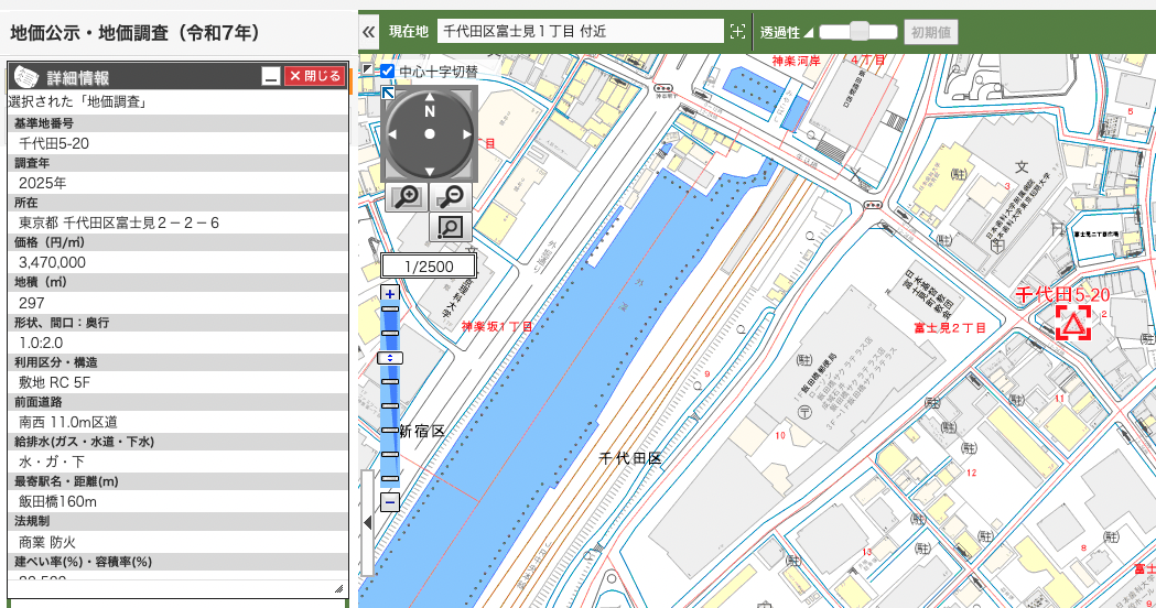 前者の不動産情報ライブラリを利用して調べる場合は、地図を開いた後、「価格情報」のタブにある「国土交通省地価公示」にチェックを入れて「決定」をクリックしてください。