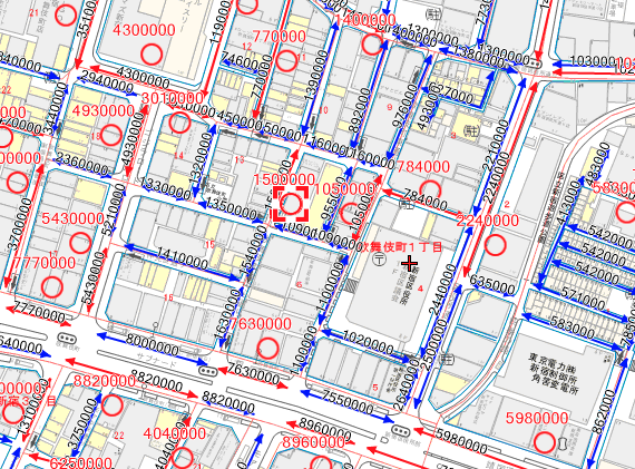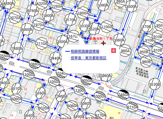 全国地価マップから調べる場合は、「相続税路線価等」における地図を開いた後、地図上にある路線をクリックしてください。