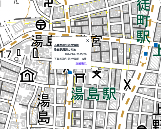 続いて、地図上にある青色の四角をクリックすると、付近の不動産取引価格情報が表示されます。