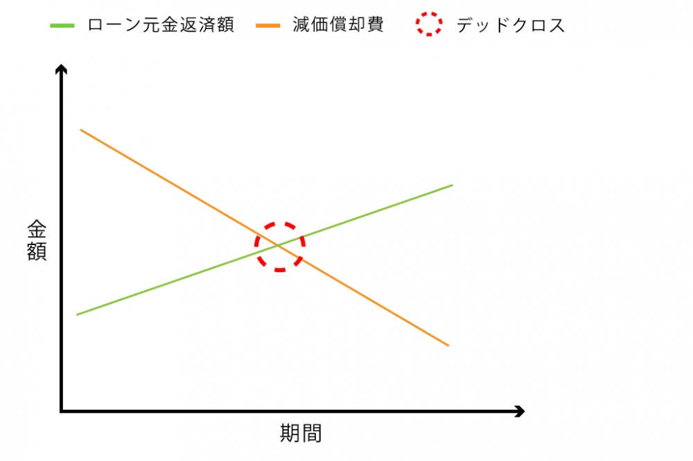 長期で不動産投資を進めるうえで、注意しておきたい考え方の一つがデッドクロスです。デッドクロスとは、ローンの返済元金が減価償却費を上回っている状態のことを指します。不動産所得に伴う所得税額が増大するため、デッドクロスは年間で見たときのキャッシュフローが悪化する一因です。