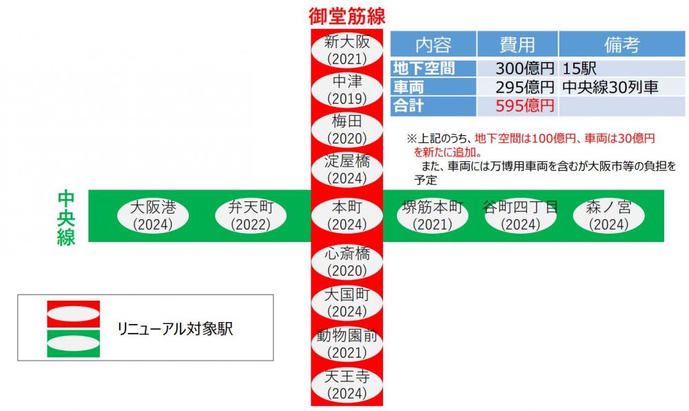 「地下空間の大規模改革」でのリニューアル対象駅は御堂筋線で9駅、中央線で6駅。